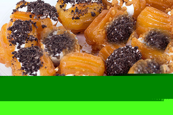 Chopped konafa with caramel sauce, delicious profiterole pieces with hazelnuts and dates