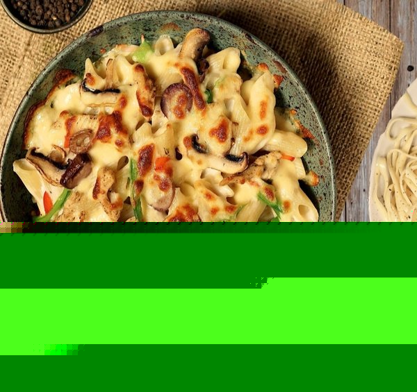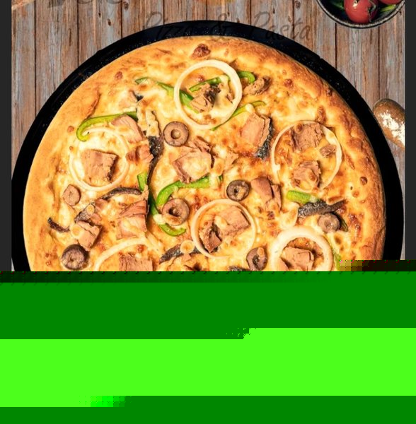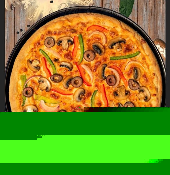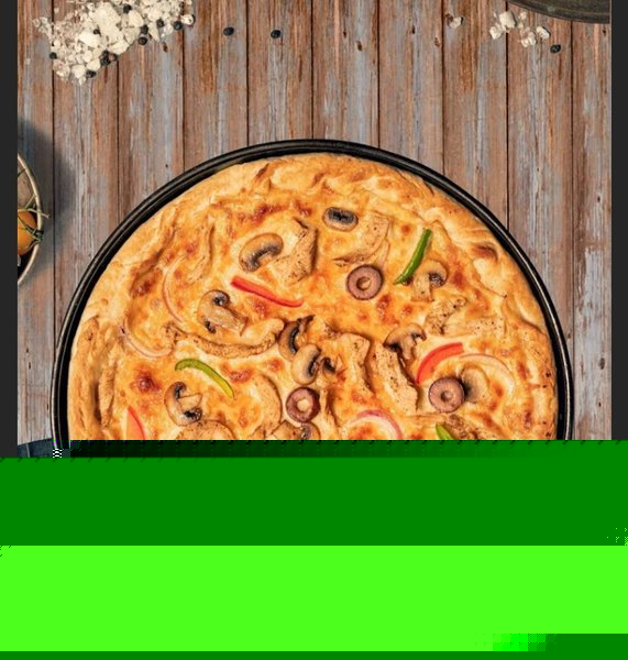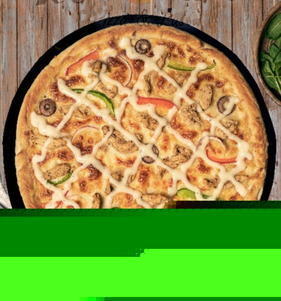 Chicken breasts, mushroom, mozzarella, colored pepper, onion, olives, pizza sauce