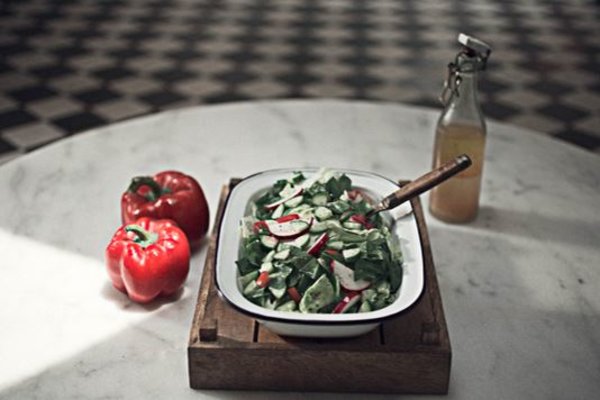 Slices of smoked herring fillet, lettuce, rocca, spring onions with lemon dressing