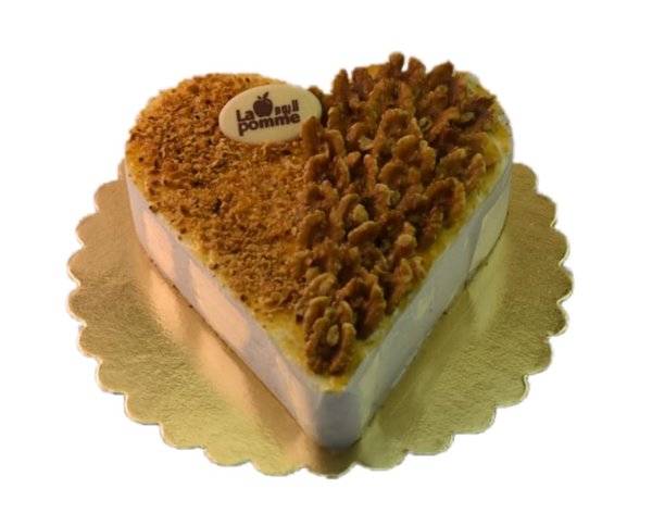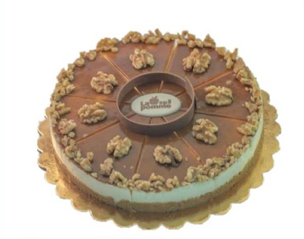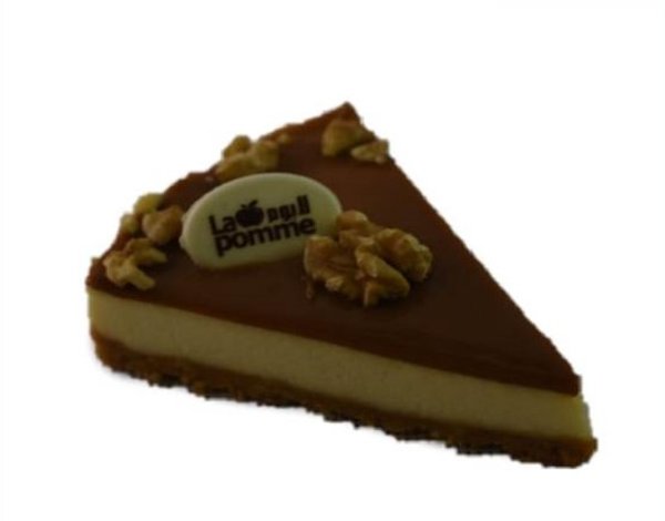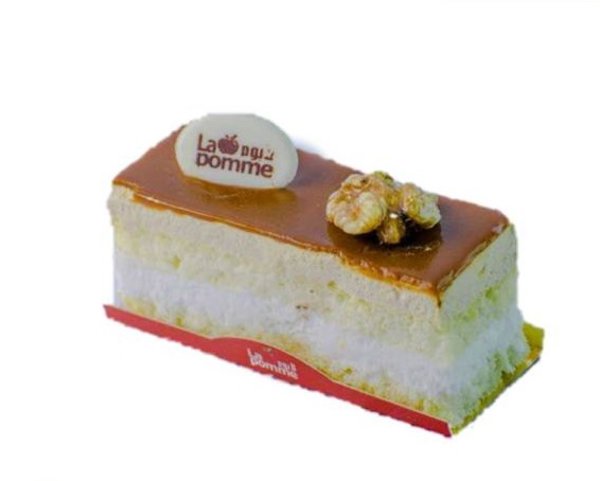 Vanilla sponge, whipped cream, topped with caramel sauce and walnut