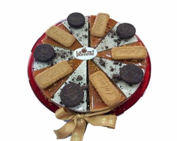 Crushed lotus biscuit with refined vanilla sponge and frosting cream and covered with a whole lotus piece on each piece
