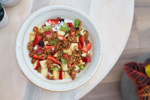 Black beans, corn, tomatom, avocado and shredded lettuce