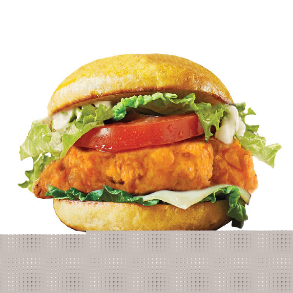 Crispy Chicken Burger4 oz crispy spicy chicken breast topped with cheddar cheese, lettuce, pickles, tomato, ranch house sauce, burger bun, 544 cal |