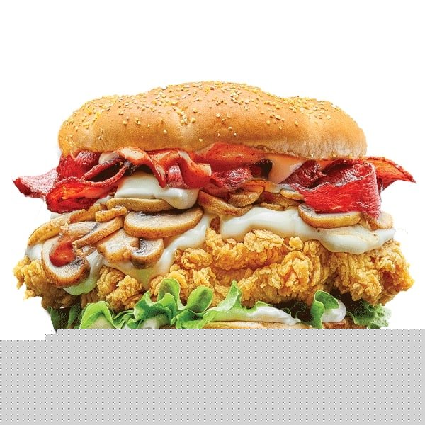 Crispy cheese stuffed with beef bacon, topped with crispy onion, BBQ sauce, grilled burger patty, and smoked cheese sauce with mushroom