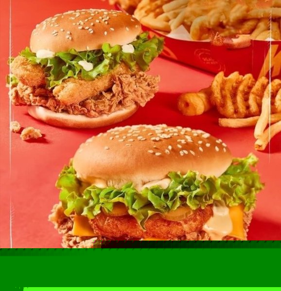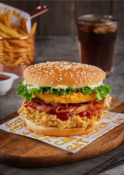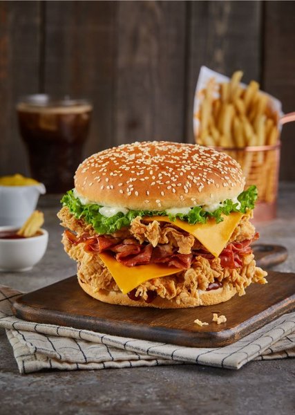 Chicken breasts, hash brown, 2 cheese, pickles, BBQ sauce, South sauce, pepper sauce and bread with sesame
