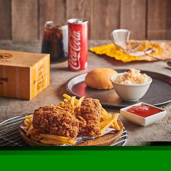 2 chicken pieces, large fries, rice, coleslaw, bun, garlic dip and drink