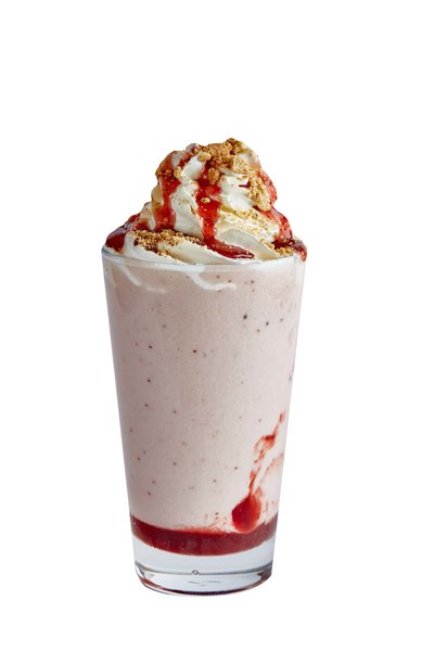 Cilantro's creamy ice cold vanilla frappe blended with a sweet strawberry flavor topped with whipped cream
