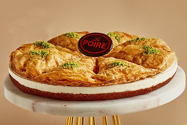 Layer of basbousa with baladi samna, white chocolate, La Poire baklava, garnished with crushed pistachio