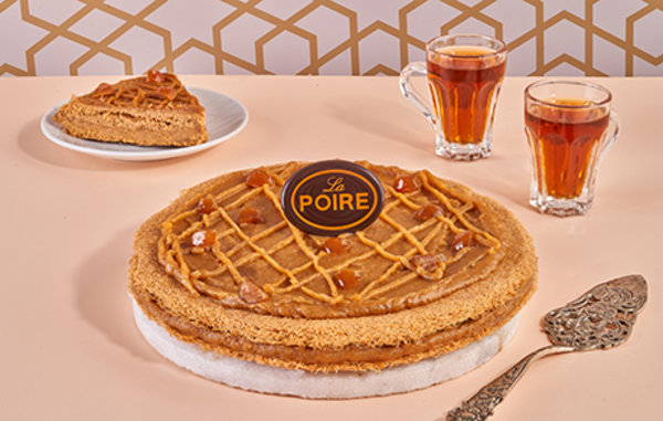 Layer of La Poire konafa othmanlya stuffed with La Poire cream garnished with pistachio, almond, pistachio croquant