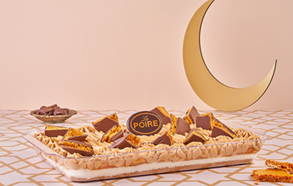Layer of crispy biscuits, nutella, cream stuffed with walnuts, La Poire konafa othmanlya, maltesers, caramelized toffee