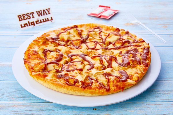Chicken pieces, BBQ sauce, mozzarella, tomato, pepper and olives