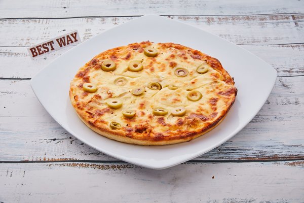 Crispy chicken breasts, tomato, pepper, olives and mozzarella