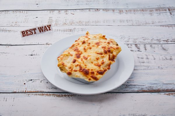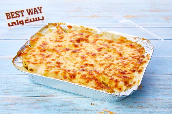 Panne, pastrami, tomato, pepper, olives and mozzarella