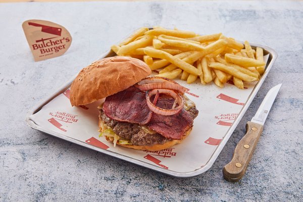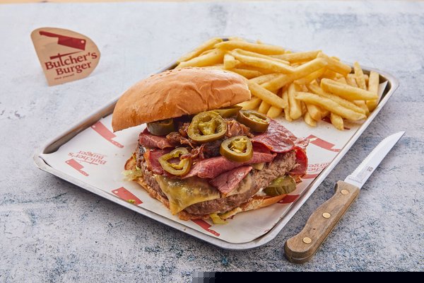 300 gm, double cheese, beef bacon, caramelized onions, jalapenos, lettuce, pickles, garlic mayo