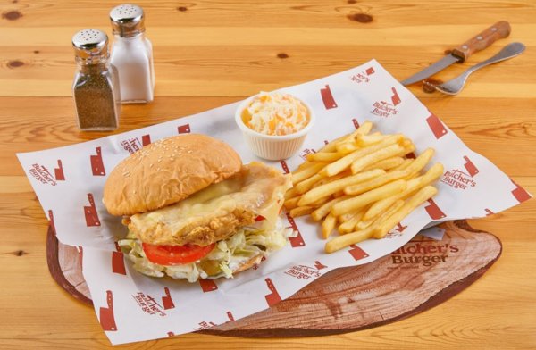 Fried chicken fillet, lettuce,cheese, tomatoes, pickles, BB mayo