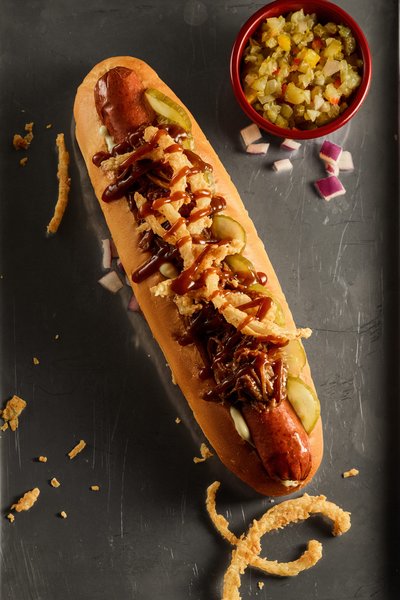 Onion rings, cheddar cheese, BBQ sauce, jalapenos, lettuce, smoky mayo