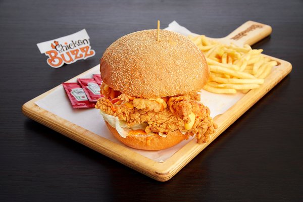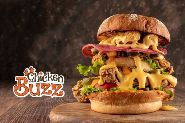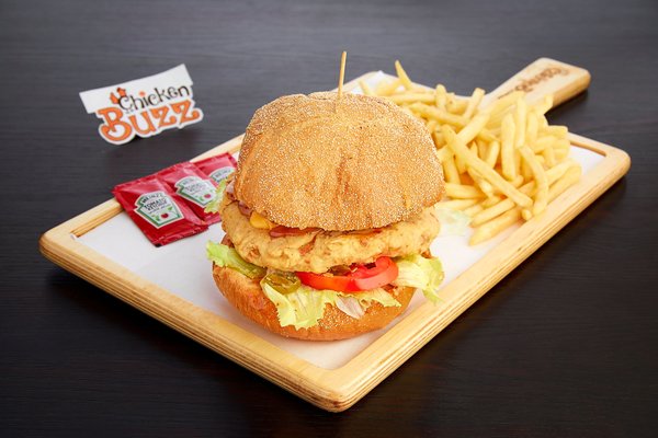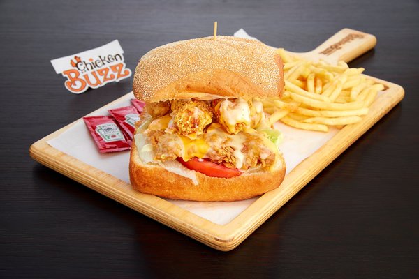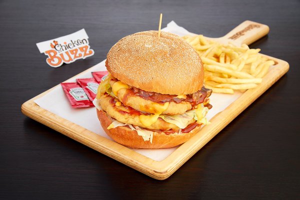 Mayo chili sauce, lettuce, tomato, crunchy chicken breast with spicy marinated, spicy fried cheddar sticks, cheddar cheese sauce, tomato, jalapeno pepper with smoked beef slices
