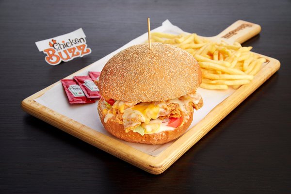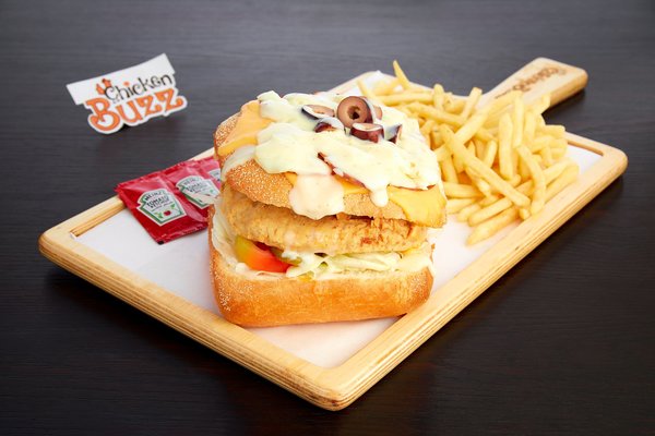 Square burger bread, ranch sauce, lettuce, tomato, chicken burger stuffed with cheddar cheese, sauteed colored pepper, cheddar cheese sauce, black olive, pepperoni, mozzarella cheese