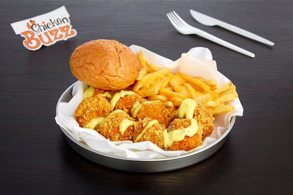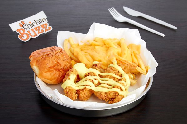 Fries, cheddar cheese sauce, crunchy chicken balls, honey mustard sauce, with bread piece and of your favorite juice