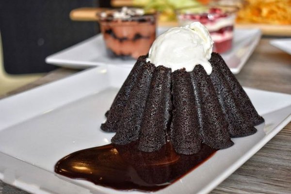 Chocolate cake stuffed with chocolate fudge served hot with ice cream and caramel sauce