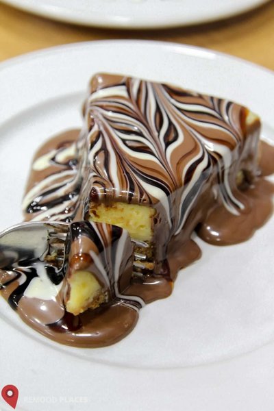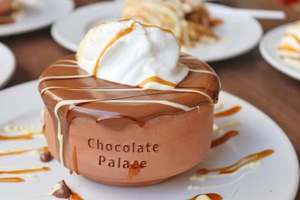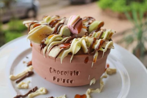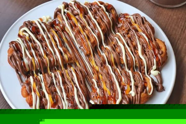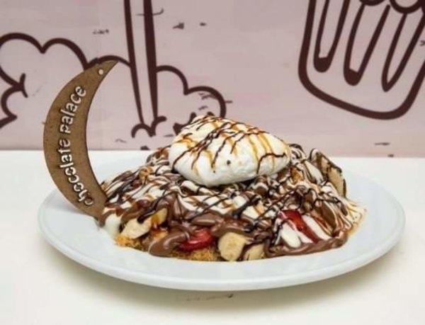 Waffle pieces, fruits ice cream, nutella, white chocolate, brown chocolate