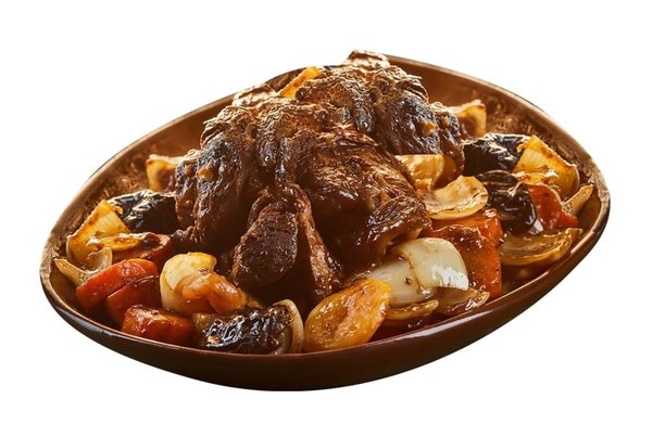 Slow cooked veal with dried apricot and prunes, served with boulangere potatoes