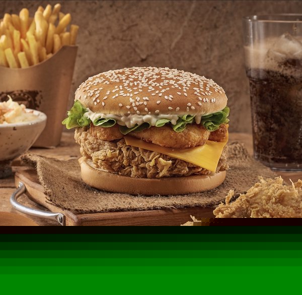 Chicken breasts, hash brown, 2 cheese, pickles, BBQ sauce, South sauce, pepper sauce and bread with sesame