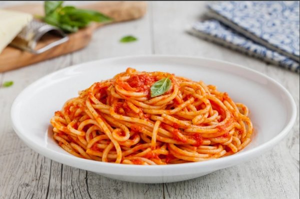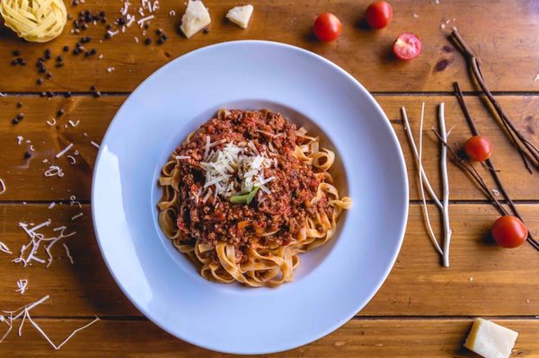 Homemade tagliatelle topped with tomato sauce and minced meat