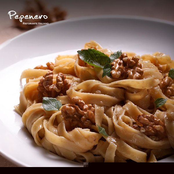 Homemade tagliatelle pasta with roasted garlic and walnuts