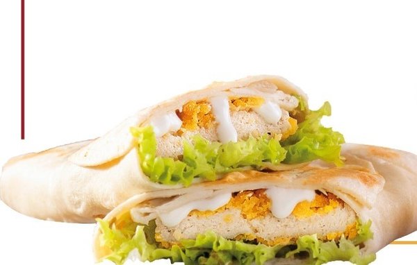 Chicken burger with mayonnaise, lettuce, wrapped in tortilla