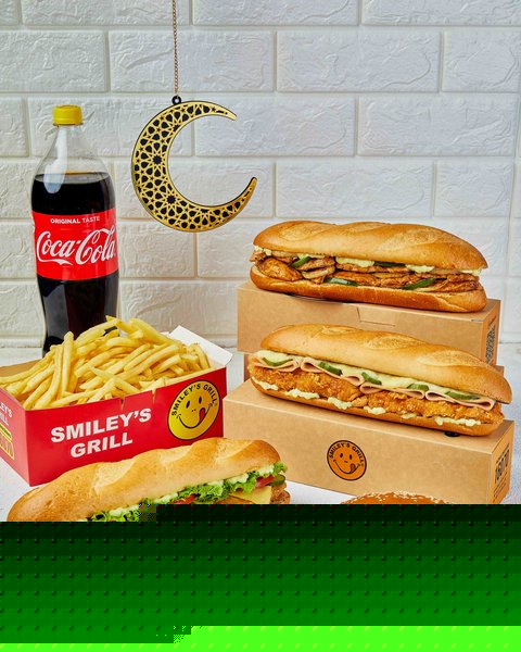 2 sandwiches form your choice, 0.8 liter drink, 2 medium fries, Smiley's BBQ sauce or Smiley's mayonnaise