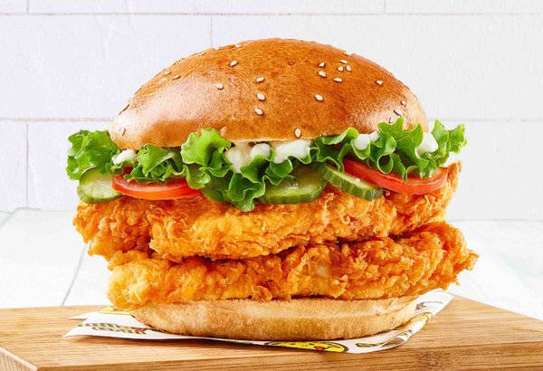 Double crispy slices of chicken breast spiced and served with Smiley's special mayonnaise, lettuce, tomatoes and pickled cucumber in Smiley's special bread