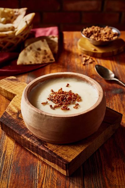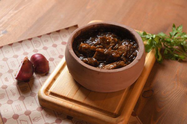 With vinegar, garlic, tomato sauce, baladi bread, veal mouza meat