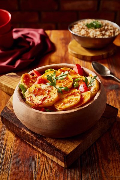 With vinegar, garlic, tomato sauce, baladi bread, fried veal meat