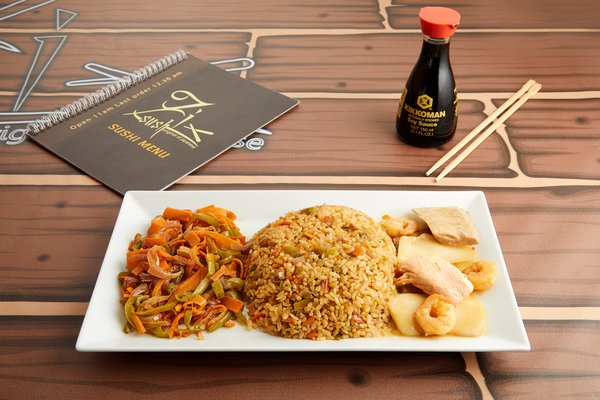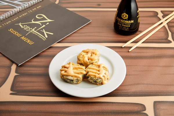 Shrimp Tempura, cheese, avocado, wrapped with crispy rice, smoked salmon, teriyaki sauce