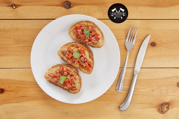 Home baked pizza bread topped with diced tomatoes, fresh garlic and basil