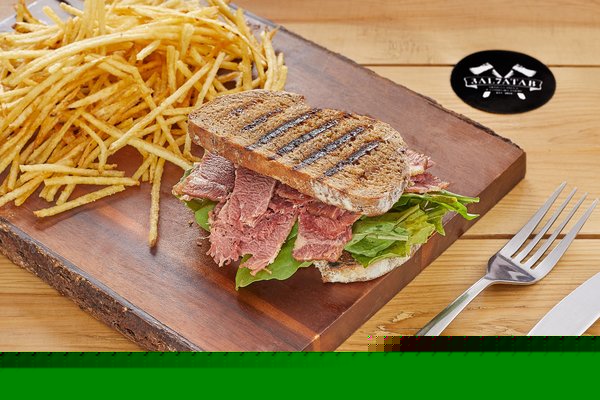 Home cured beef brisket slices, topped with arugula and Dijon mustard, served on toasted rye bread
