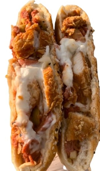 Chicken shawerma slices, yellow basmati rice, toasted bread, garlic dip, mozzarella cheese