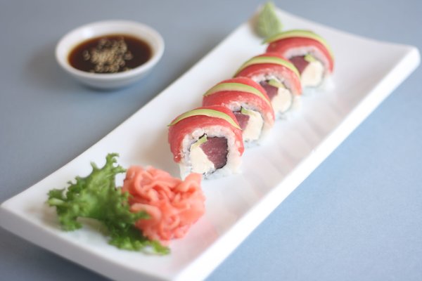 Eel, avocado, teriyaki sauce, covered with avocado slice and sesame