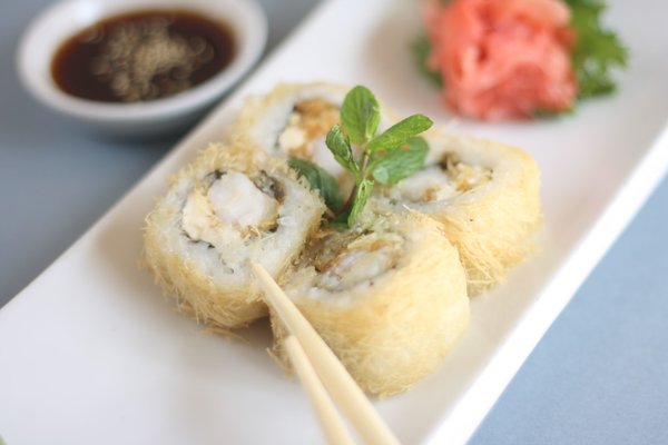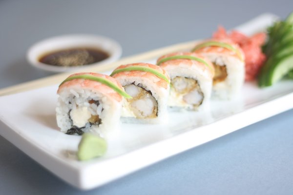 Salmon, shrimp, avocado, cucumber, seaweed, rice wrapped in fried tempura