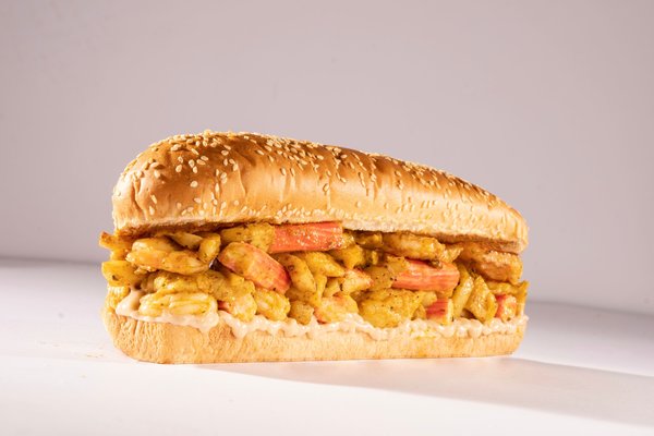 Shrimp CaboyBurger pieces, 3 fried shrimp pieces, cheese sauce, BBQ sauce, lettuce and cucumber |