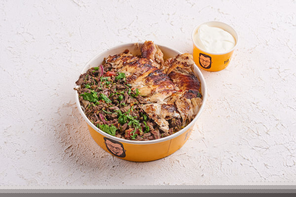 Mix chicken, basmati rice, Lebanese crispy bread, garlic dip