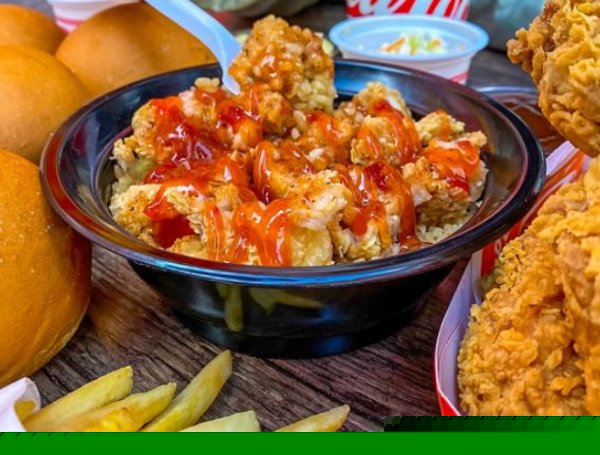 Chicken pieces with Chicken Planet special sauce, large coleslaw, large fries, large soft drink and bread
