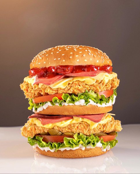 Crispy chicken breasts, smoked beef bacon, American cheese slices, cheddar sauce, sweet chili sauce, jalapeno pepper, lettuce, pickled cucumber, tomato and creamy mayonnaise sauce
