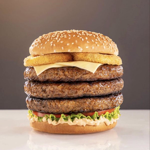 Grilled burger, American cheddar cheese slice, creamy mayonnaise, fried onion rings, BBQ sauce, lettuce, tomato and pickled cucumber