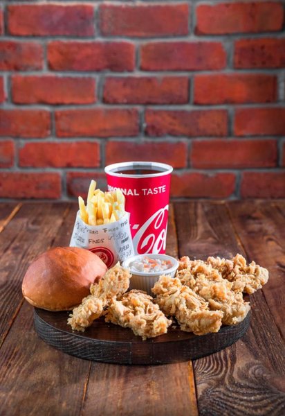 Crispy chicken breasts pieces, bread, coleslaw, fries and drink