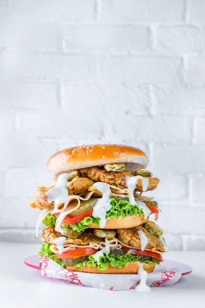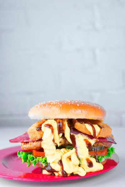 Crispy chicken, lettuce, tomatoes, pickled cucumber, mayonnaise, onion rings, smoked beef, BBQ sauce and cheese sauce