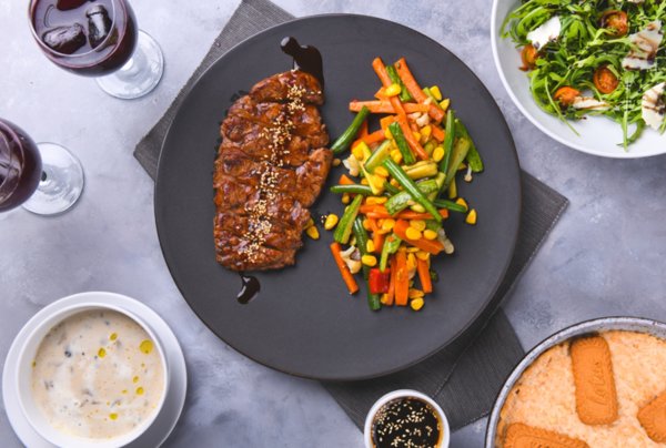 Ramadan drinks, soup, salad, grilled salmon with risotto, roca, sauteed vegetables, onion, dill-caper cream sauce