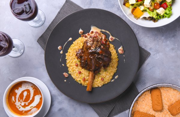 lamb mouza with freekeh style risotto and vegetables, served with pomegranate sauce