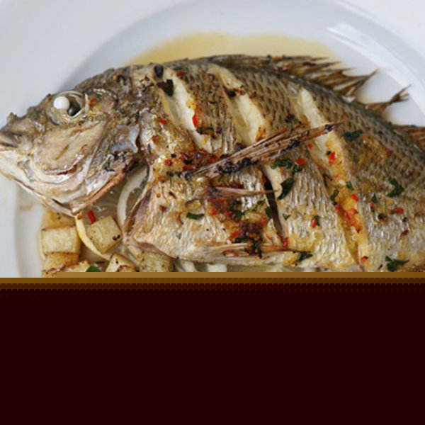 4 grey mullet fish (350 gm fish) grilled with oil and lemon, 500 gm fried fish fillet and 500 gm fried calamari, served with saydia rice, tehina, green salad, baba ghanoug, pickled cucumber and 5 bread